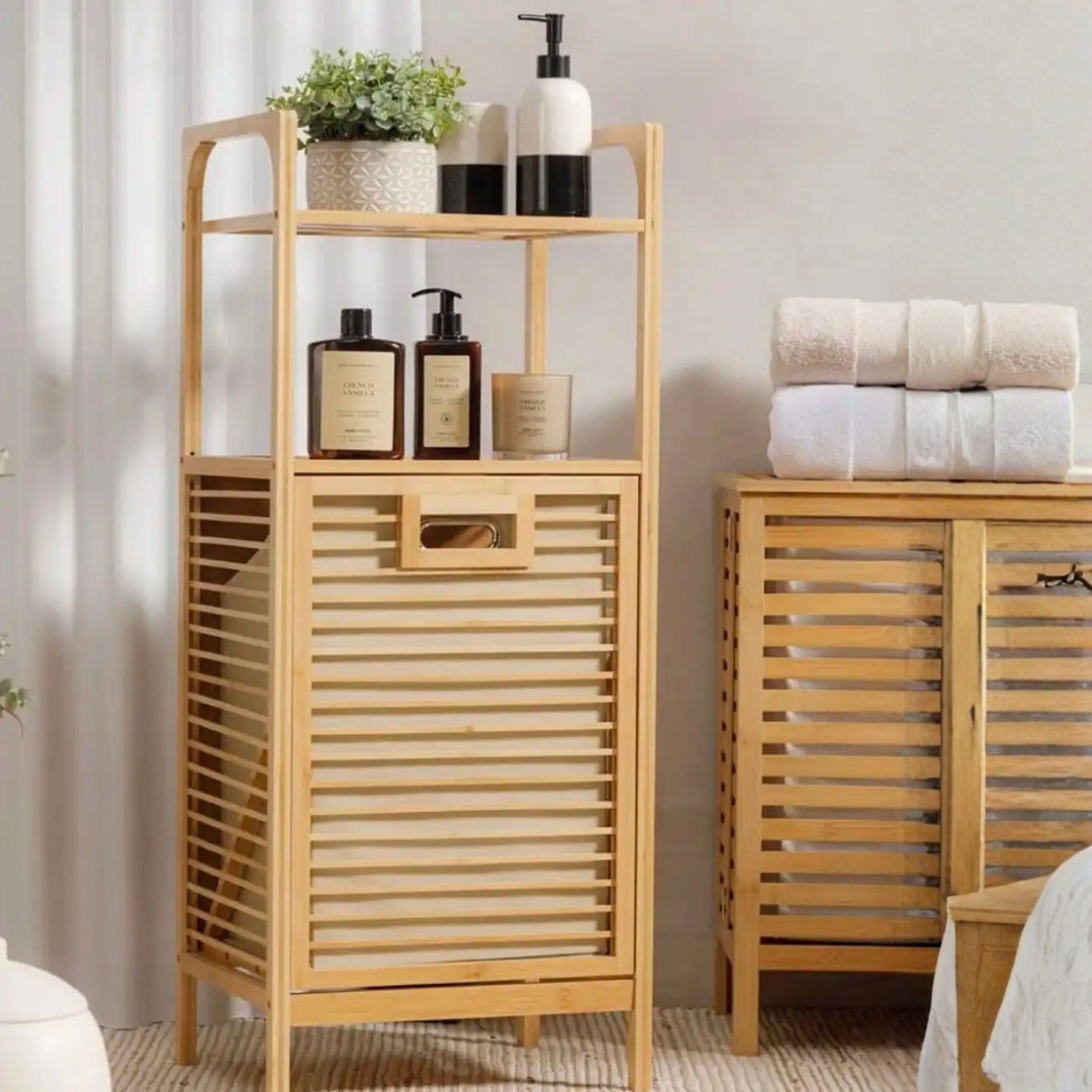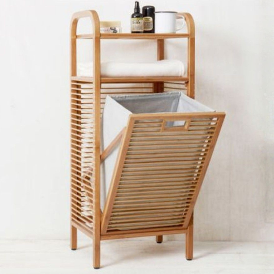 وحدة تخزين خشبية ريقة تجمع بين أرفف تنظيم علوية وسلة غسيل مخفية تفتح بشكل مائل لتوفير المساحة.